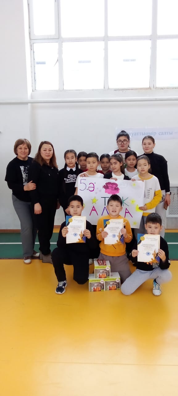 "Салауатты өмір салты-жарқын болашақ" атты тақырыпта 5а,5ә,5в сыныптар арасында эстафеталық жарыс өткізілді. Мақсаты:Оқушылар мен ата- аналардың мектепке белсенділіктерін нығайту,ептіліктерін, шапшандылықтарын, батылдықтарын, күштіліктерін арттыру мақсатында сынып жетекшілері жарыс ұйымдастырылды.