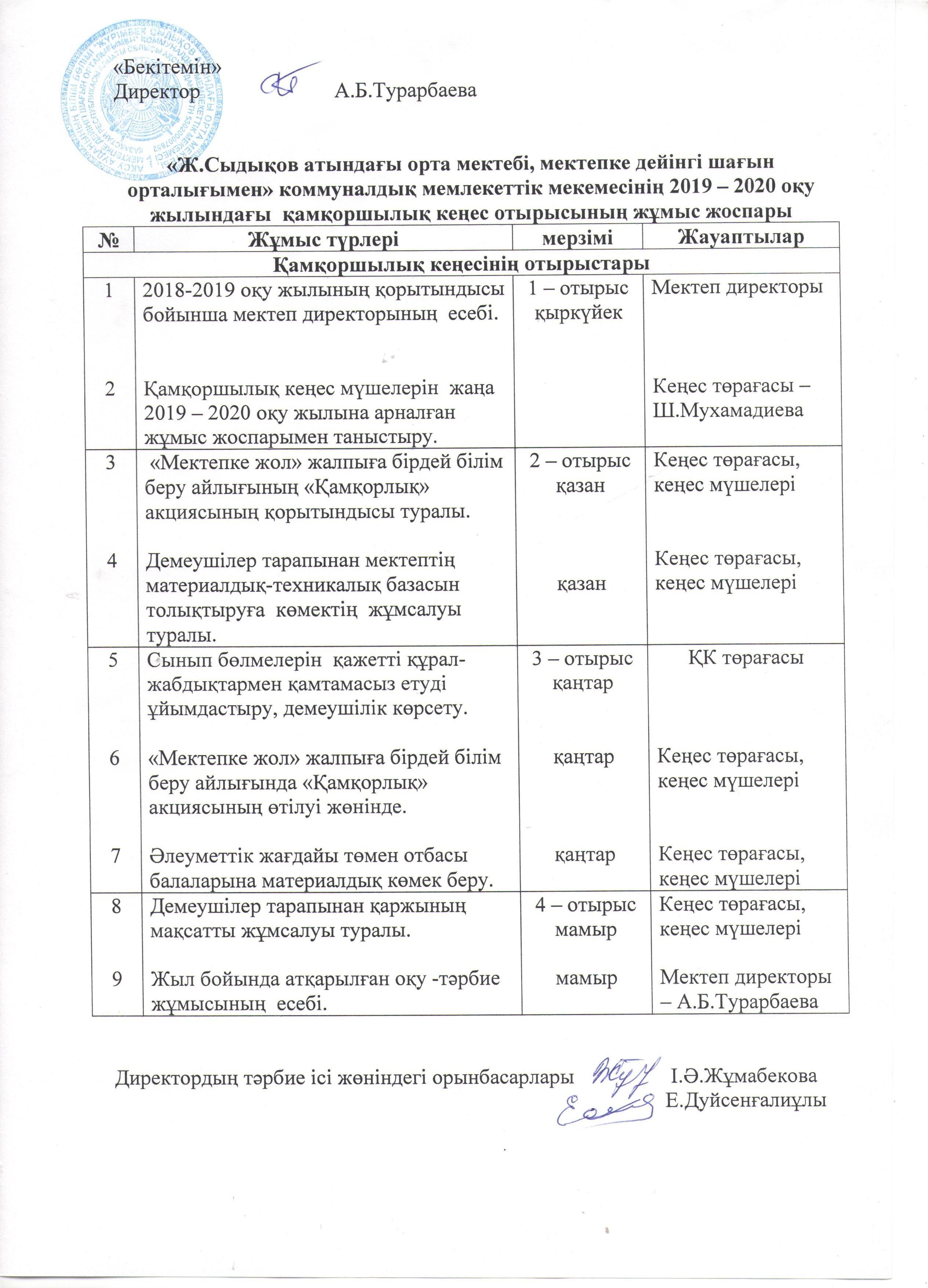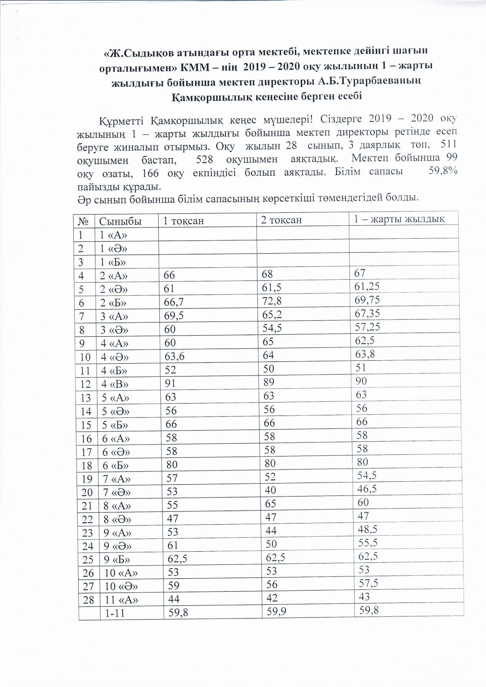 "Жүрімбек Сыдықов атындағы орта мектебі, мектепке дейінгі шағын орталығымен" коммуналдық мемлекеттік мекемесінің 2019-2020 оқу жылының І-жарты жылдығы бойынша мектеп директоры А.Б.Турарбаеваның Қамқоршылық кеңесіне берген есебі https://sydykov-aksu.mektebi.kz/otkrytyj-organ/popechitelskij-sovet/151-zhrmbek-sydyov-atynday-orta-mekteb-mektepke-dejng-shayn-ortalyymen-kommunaldy-memlekettk-mekemesn-2019-2020-ou-zhylyny-zharty-zhyldyy-bojynsha-mektep-direktory-abturarbaevany-amorshyly-keesn.html https://sydykov-aksu.mektebi.kz/otkrytyj-organ/popechitelskij-sovet/151-zhrmbek-sydyov-atynday-orta-mekteb-mektepke-dejng-shayn-ortalyymen-kommunaldy-memlekettk-mekemesn-2019-2020-ou-zhylyny-zharty-zhyldyy-bojynsha-mektep-direktory-abturarbaevany-amorshyly-keesn.html