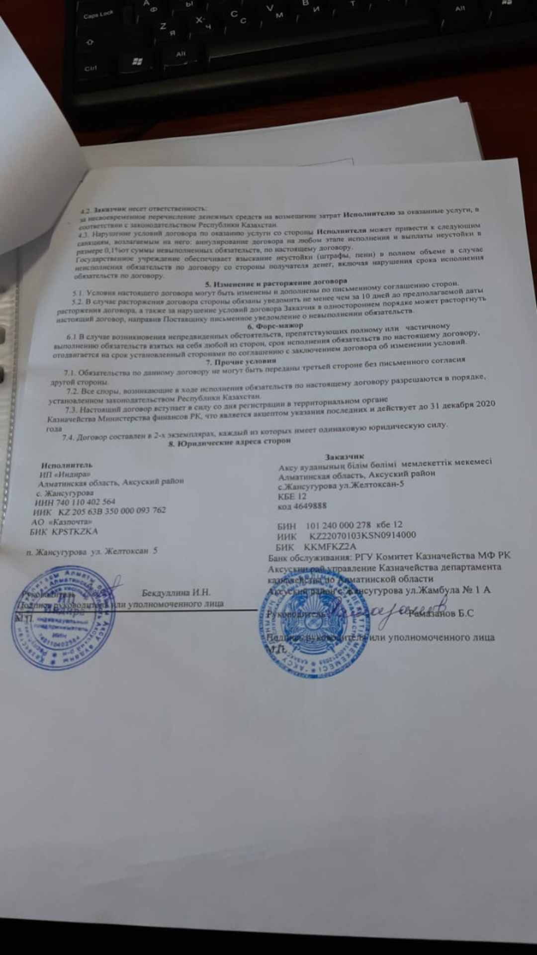 Келісім шарт » "Жүрімбек Сыдықов атындағы орта мектебі, мектепке дейінгі шағын орталығымен" Education Department of Kerbulak district