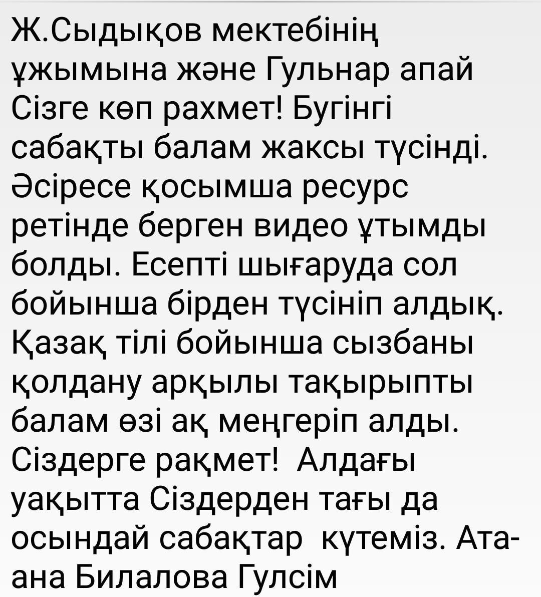 Елімізде болып жатқан қашықтықтан оқу барысында өтіп жатқан сабақтар бойынша Ж.Сыдықов атындағы орта мектебінің ата-ана,ұстаз және оқушының пікірлері » "Жүрімбек Сыдықов атындағы орта мектебі, мектепке дейінгі шағын орталығымен" коммуналдық мемлекеттік мекемесі