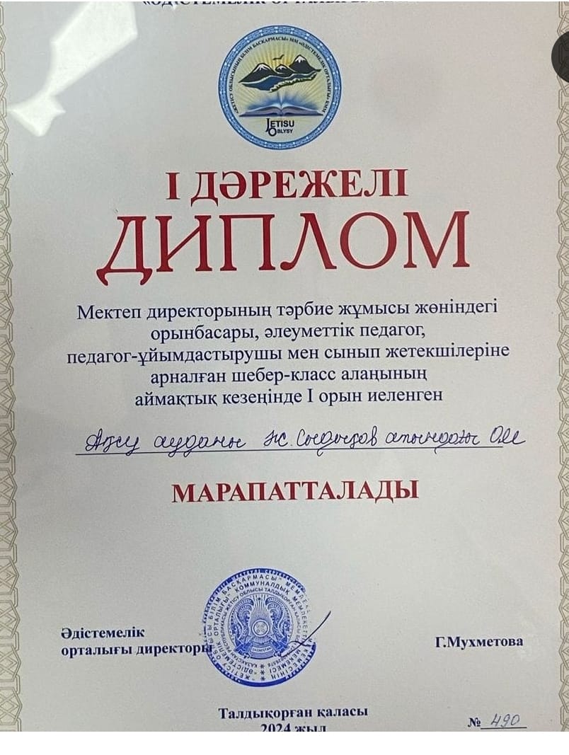 Мектеп директорының тәрбие жұмысы жөніндегі орынбасары, әлеуметтік педагог, педагог ұйымдастырушы мен сынып жетекшілеріне арналған шебер класс алаңының аймақтық кезеңінде мектебіміздің аталған мамандары І дәрежелі диплом иеленді