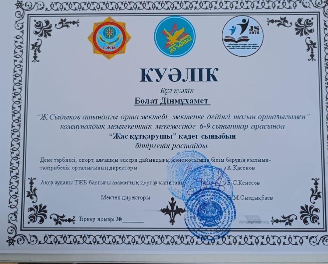 Жүрімбек Сыдықов атындағы орта мектебінде 2024 жылдың 24 мамырында 9а және 9ә сыныптарында «Білімім отаныма» атты сынып сағаты өтті. сынып сағаты мемлекеттік гимн орындаудан басталды. сынып сағаты барысында Мектеп директоры Ә.М.Сыздықбаев 9 сынып оқушыларын оқу жылының аяқталуымен құттықтады және 9а сынып оқушыларына «Жас құтқарушы»кадет сыныбын, 9ә сынып оқушыларына «Жас сарбаз» кадет сыныбын аяқтады деген куәлік берілді. Сынып сағатының соңында оқушылар жетістіктері бойынша марапатталды.#aksu_bilim_bolimi20