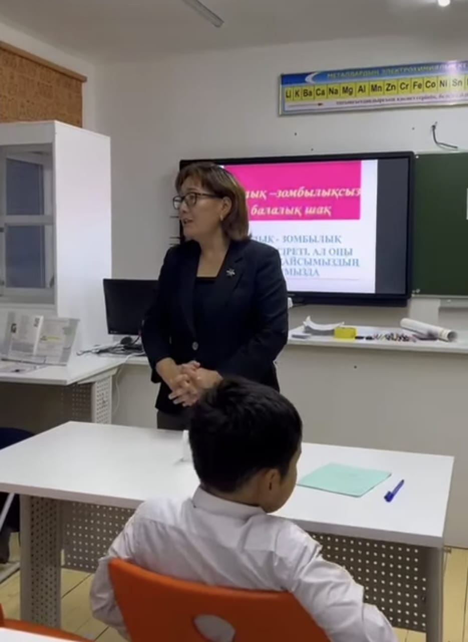 8-қараша күні 5-сынып оқушыларымен "Зорлық-зомбылыққа жол жоқ"тақырыбында тренинг сабақ өткізілді.Мақсаты:Жас өспірімдерге зорлық зомбылық туралы мағлұмат беру, оқушылар арасында жағымды,ізгі,мейірімді қасиетті қалыптастыру. Мектеп психологы А.Сейтқазы оқушыларға зорлық-зомбылық туралы мәлімет беріп, түрлерімен,зардаптарымен таныстырды.Соңында оқушылармен кері байланыс жасалынып, өз ойларымен бөлісті.