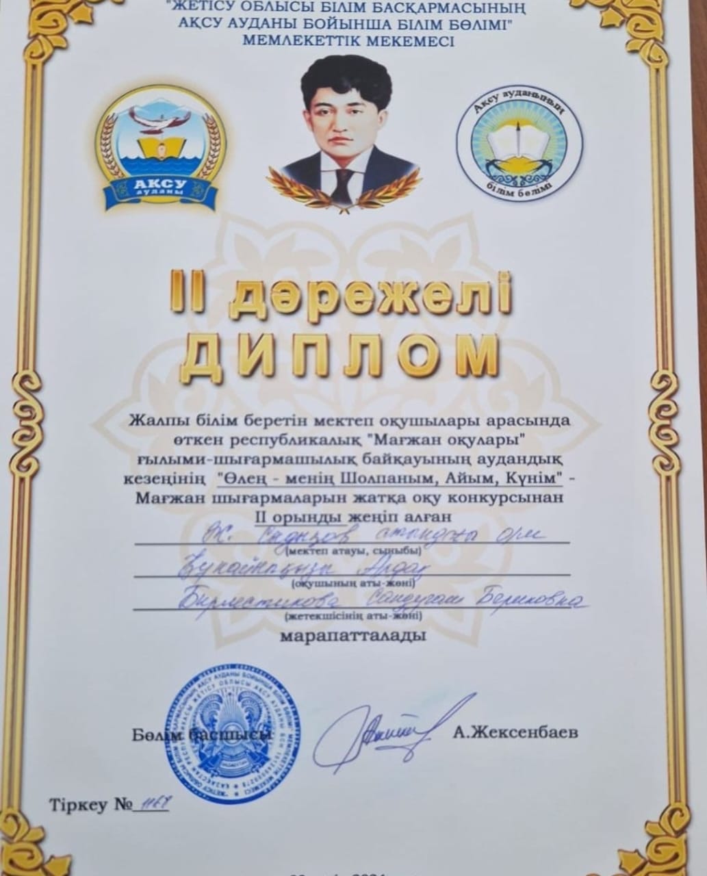 Жалпы білім беретін мектеп оқушылары арасында өткен республикалық "Мағжан оқулары" ғылыми-шығармашылық байқауының аудандық кезеңінен "Өлең- менің Шолпаным, Айым, Күнім" Мағжан шығармаларын жатқа оқу конкурсынан мектебіміздің 7б сынып оқушысы Құнайыпқызы Ардақ жүлделі 2-орын иеленді. Жетекшісі С.Б.Бірлестикова#aksu_bilim_bolimi20