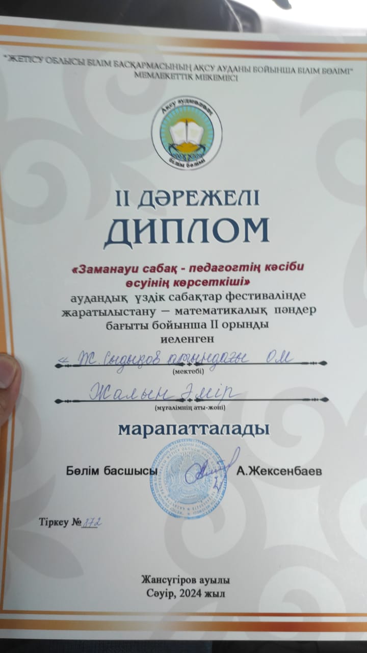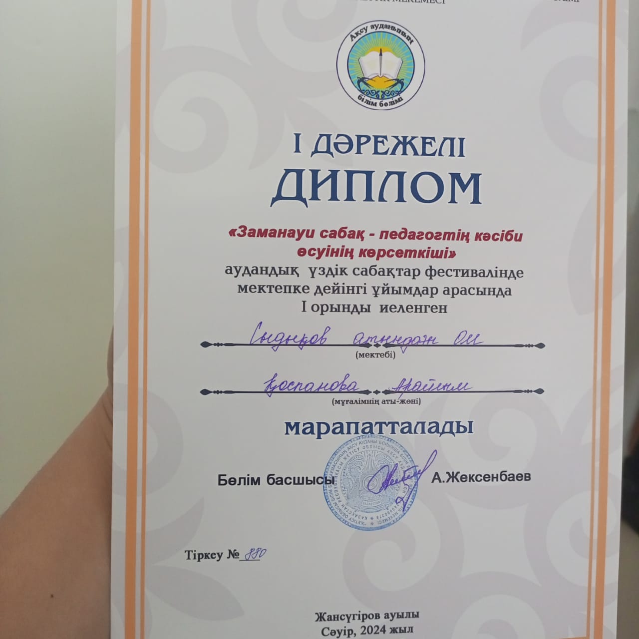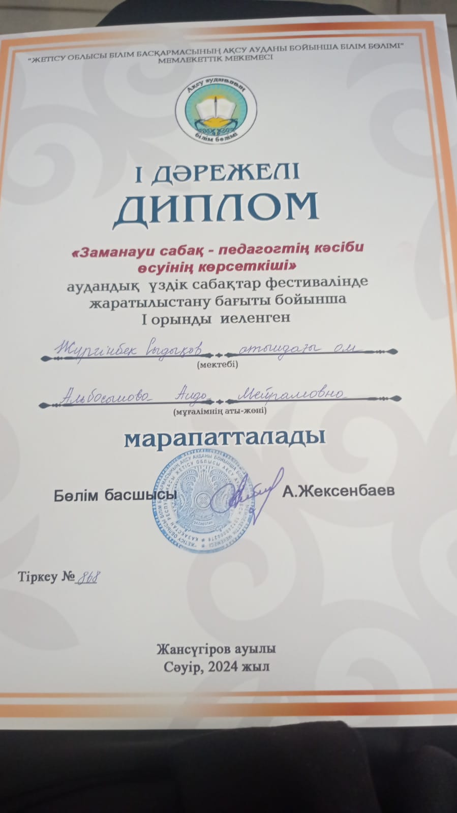 "Заманауи сабақ-педагогтың кәсіби өсуінің көрсеткіші" аудандық үздік сабақтар фестиваліне қатысқан ұстаздарымыз Ә.Құрметжан, А.Қоспанова, А.Альбосынова жүлделі 1 орын, Ә.Жалын, М.Мусабеков, Е.Агафонова жүлделі 2 орын, М.Жұмабекова жүлделі 3 орын иеленді. Жүлдемен оралған ұстаздарымызға шығармашылықтарын шыңдай түсулеріне тілектеспіз!#aksu_bilim_bolimi20