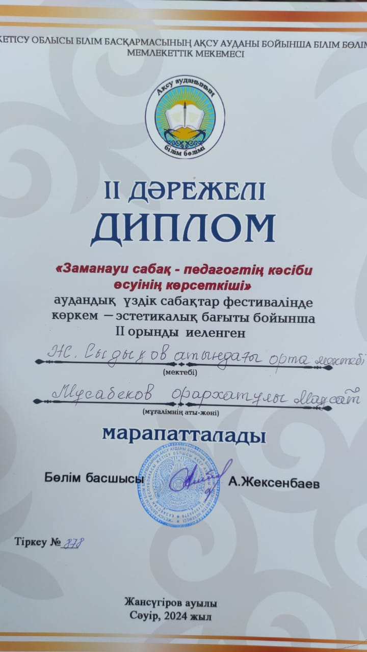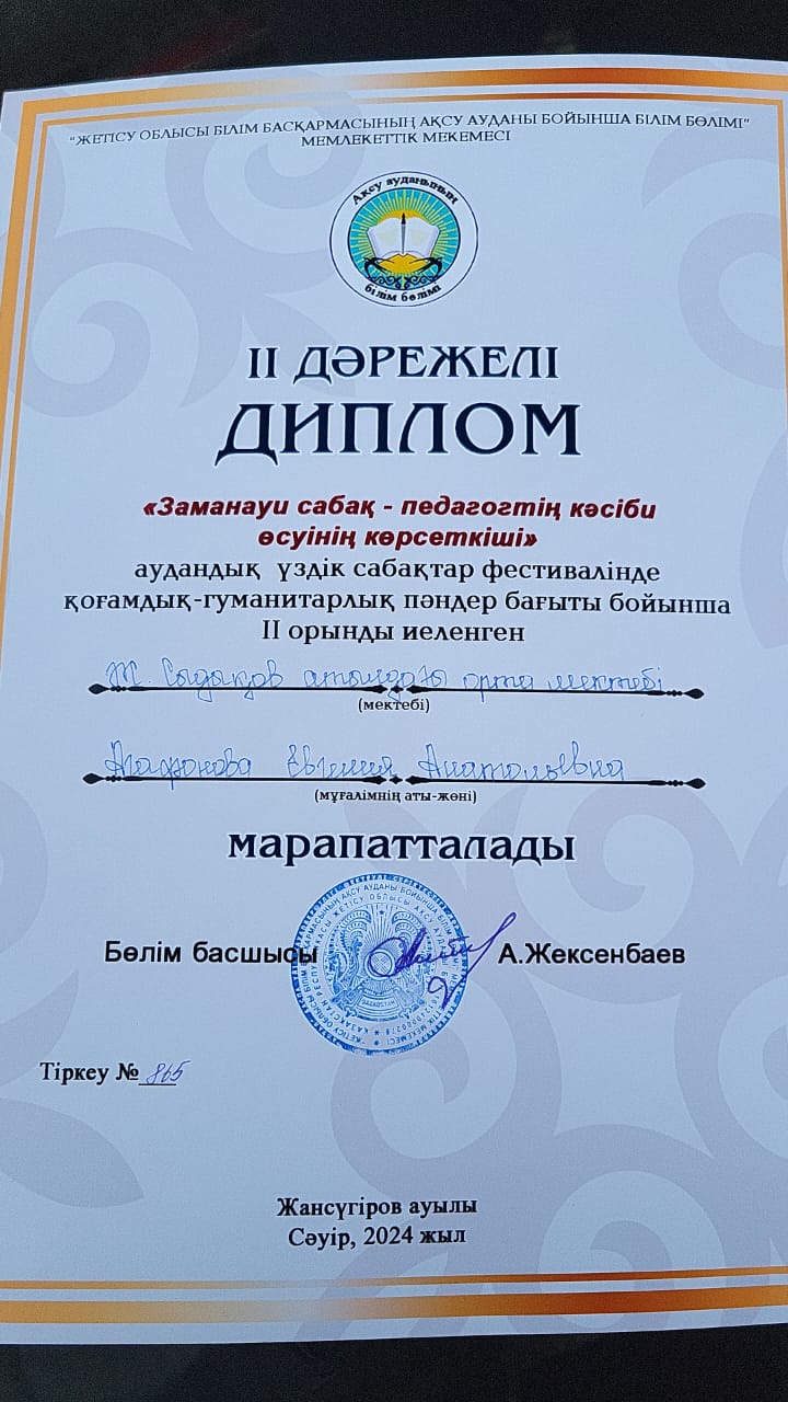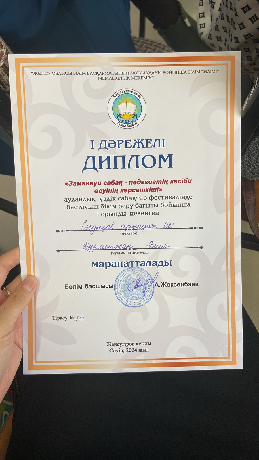 "Заманауи сабақ-педагогтың кәсіби өсуінің көрсеткіші" аудандық үздік сабақтар фестиваліне қатысқан ұстаздарымыз Ә.Құрметжан, А.Қоспанова, А.Альбосынова жүлделі 1 орын, Ә.Жалын, М.Мусабеков, Е.Агафонова жүлделі 2 орын, М.Жұмабекова жүлделі 3 орын иеленді. Жүлдемен оралған ұстаздарымызға шығармашылықтарын шыңдай түсулеріне тілектеспіз!#aksu_bilim_bolimi20