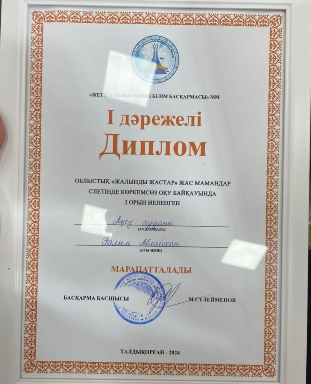 Облыстық "Жалынды жастар" жас мамандар слетінде көркемсөз оқу байқауынан география пәнінің мұғалімі Ғалым Аблайхан Ерәділұлы 1 дәрежелі диплом иеленді