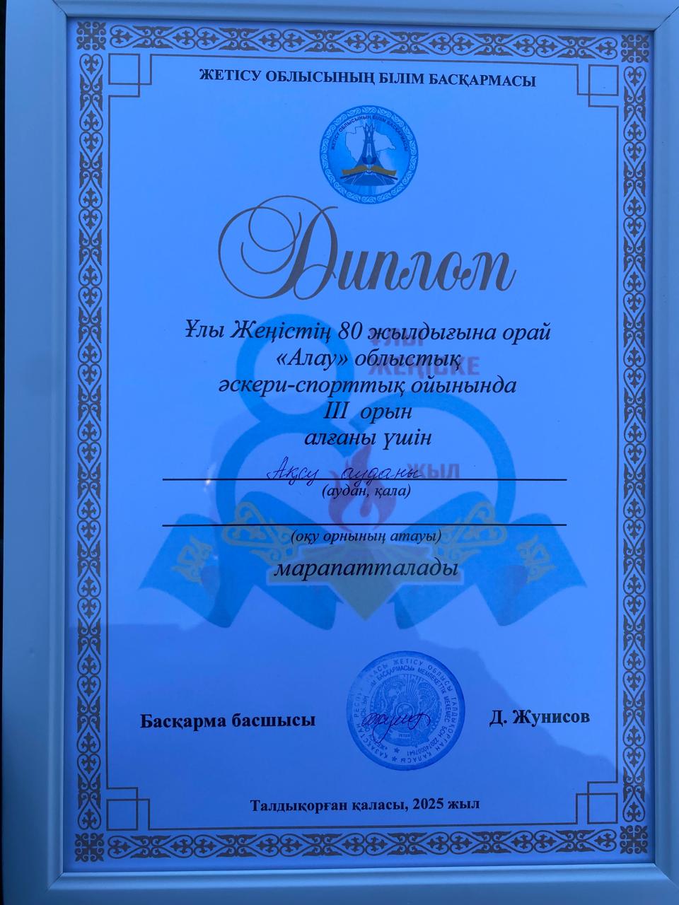 Ұлы Отан соғысындағы Жеңістің 80 жылдығына орай облыстық “Алау” әскери-спорттық ойынынан жүлделі ІІІ-орын иеленді.