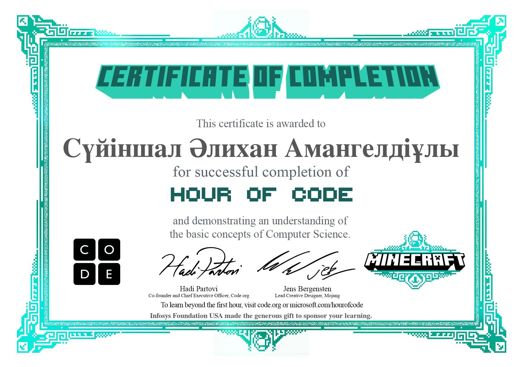 Акция барысында оқушыларға жаһандық компьютерлік аптасы аясында Қазақстан бойынша «Код сағаты 2018» акциясы өткізіліп жатқандығы хабарланып, 3-4 сынып оқушыларына компьютерлік ойындар бағдарламалар арқылы құрастырылатыны, бағдарламаны құрастырушыны бағдарламашы деп атайтындығы, 5-11 сынып оқушыларына информациялық технологиялар саласындағы мамандықтар жоғары сұранысқа ие, беделді және жоғары жалақылы болып табылатындығы айтылып, бағдарламашы мамандығы, бағдарламауды үйренуде табысқа жету жағдайын құру барысындағы бейнебаян көрсетілді. Онлайн- тренажер арқылы оқушылар ойын ойнай отырып код жазуға жаттықты. Жалпы акцияға қатысқан оқушылар бағдарламалауға үлкен қызығушылық танытты. Акцияға белсене қатысқан оқушыларға арнайы сертификаттар табысталды. «Kundelik kz» электрондық журналында ата-аналарға 3-9 желтоқсан аралығында 3-11 сыныптар аралығында «Код сағаты 2018» акциясы өткізіліп жатқандығы хабарланды.