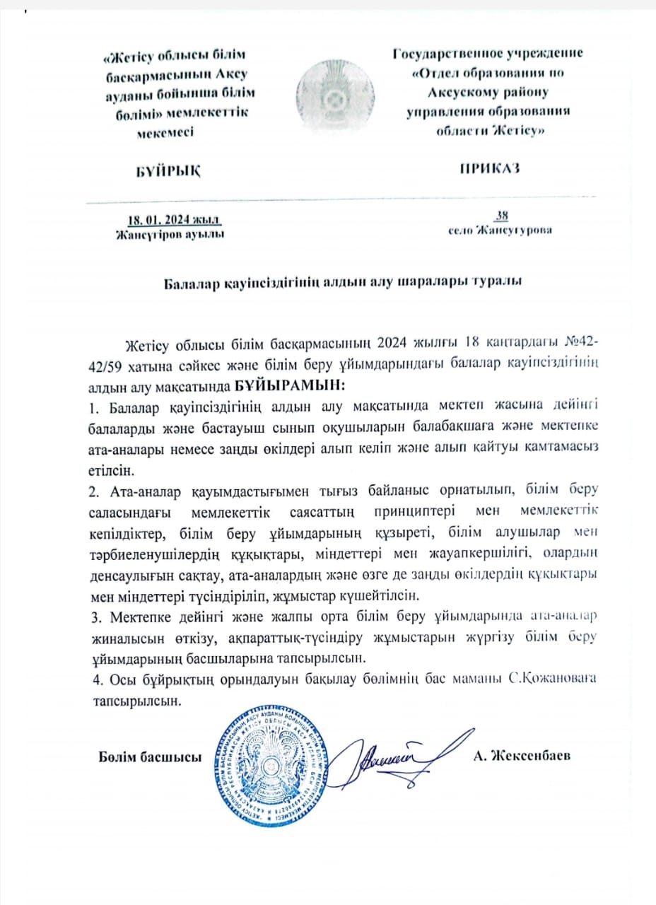 2024 жылдың 19 қаңтар күні Аудандық білім бөлімінің 38 бұйрығына сәйкес балалар қауіпсіздігінің алдын алу мақсатында мектеп жасына дейінгі балаларды және бастауыш сынып оқушыларын балабақшаға және мектепке ата- аналары немесе заңды өкілдері алып келіп және алып қайтуы қамтамасыз етілуі жайлы бастауыш сынып ата- аналарына жиналыс өткізілді.