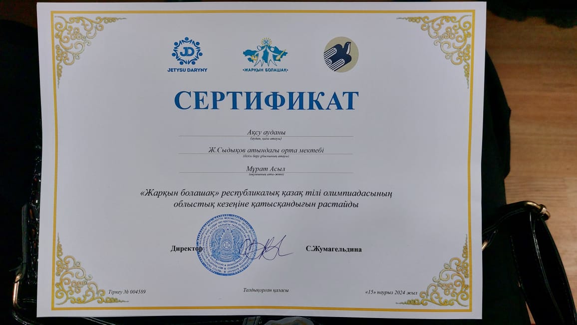 "Жарқын болашақ" олимпиадасының облыстық кезеңі » "Жүрімбек Сыдықов атындағы орта мектебі, мектепке дейінгі шағын орталығымен" отдела образования Кербулакского района